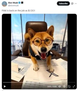 A single social media post from Elon Musk sent the FLOKI memecoin soaring on Monday. The Tesla CEO shared an AI-generated video on X showing his Shiba Inu dog, Floki, dressed as the platform’s CEO. The memecoin jumped almost 29% after Musk posted a video of his dog working as “CEO” of the social media platform.